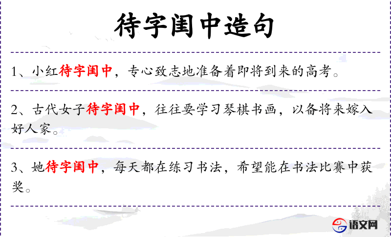 句子:“小红待字闺中,专心致志地准备着即将到来的高考。”