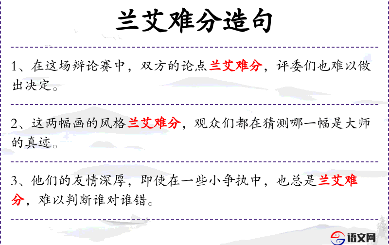- 补语:“兰艾难分,难以判断谁对谁错”