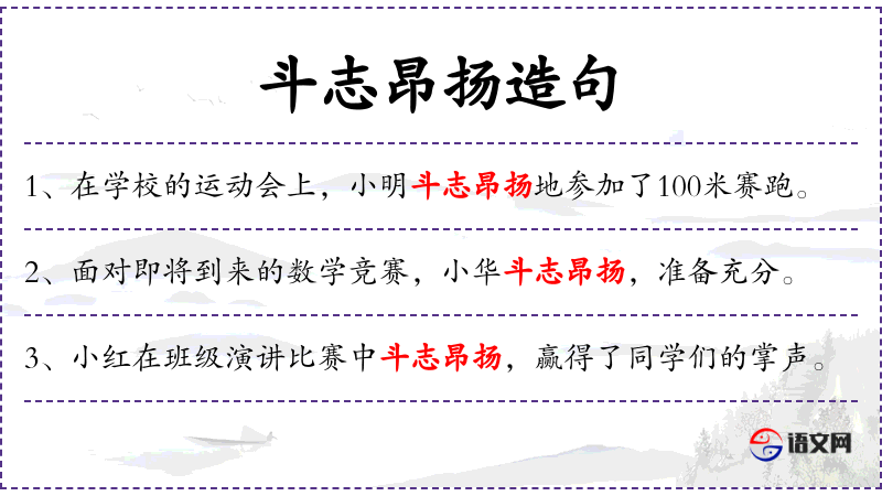 - 斗志昂扬:形容词短语,表示充满斗志、精神饱满。