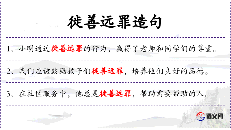 1. 【徙善远罪】 趋向善良,远离罪恶。