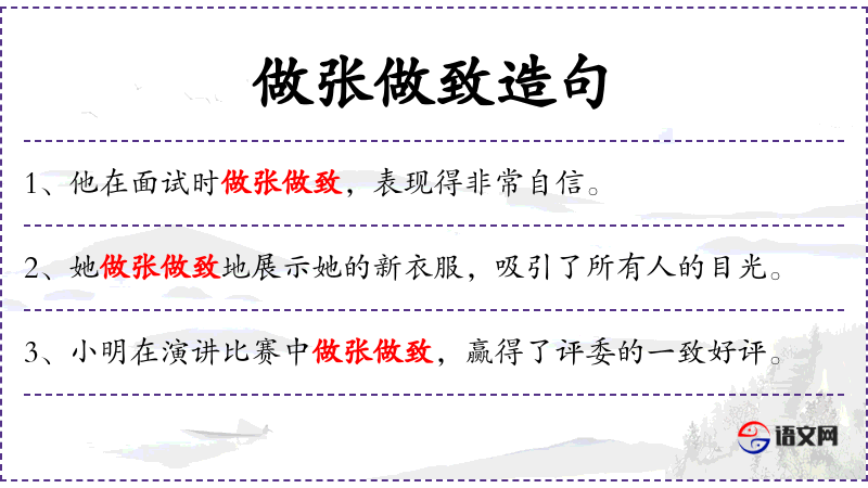 - 做张做致地:副词短语,形容做事认真、细致、有条理。