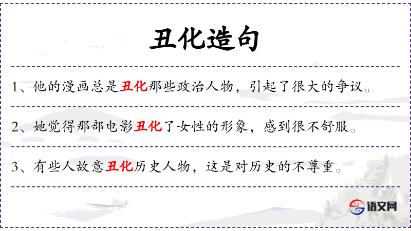 1. 【丑化】 与美化”相对。主要指通过艺术加工和改造的方法,把美的事物歪曲、诬蔑、贬低为丑的,或为揭露丑的本质,使之愈显其丑。是艺术创作中揭示事物丑的或恶的本质的手段之一; 泛指对美的、好的事物进行歪曲诬蔑,说成是丑的。