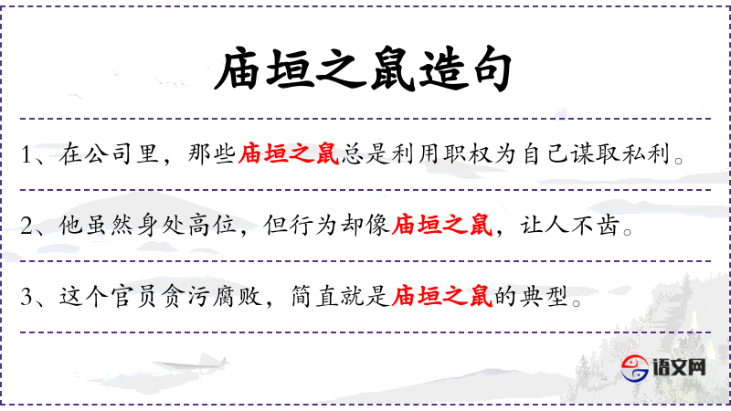 - 庙垣之鼠:这个成语来源于**古代,比喻那些在官场中利用职权为自己谋取私利的人。