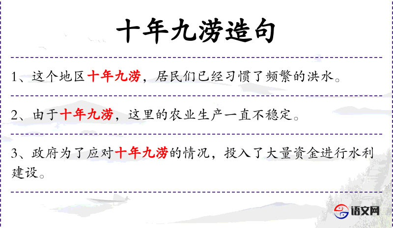 - 十年九涝:形容某个地区经常发生水灾,十年中有九年都会发生涝灾。