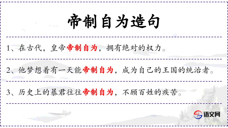 - 帝制自为:动词+名词,指个人或团体试图恢复或建立帝王制度。