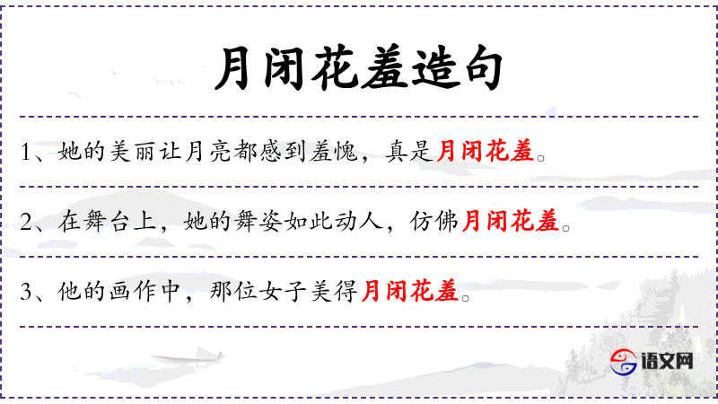 4. 【月闭花羞】 - 闭:躲避;羞:害臊。闭月形容貂禅,羞花形容杨玉环。使月亮见了也躲避起来,花儿见了也自觉羞愧。形容女子貌美。