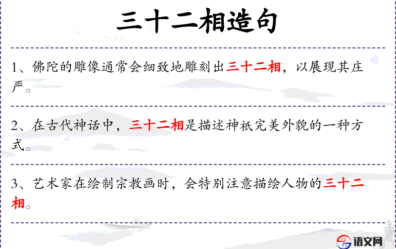 1. 【三十二相】 佛教语。谓佛陀具有的三十二种不同凡俗的显着特征,与微细特征八十种"好",合称"相好"。如足下安平﹑手指纤长﹑金色﹑丈光﹑身如师子﹑广长舌﹑绀青眼﹑顶成肉髻和眉间白毫等相。各经所举略有出入。详见《大智度论》卷四。