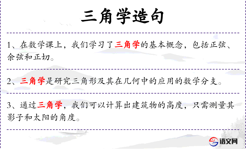 简称三角”。数学的一门分科。包括平面三角学和球面三角学。前者研究三角函数的性质和图像、三角函数式的恒等变换和解三角形等◇者研究球面三角形的边角关系,以及已知球面三角形的三个基本元素,计算它的其他基本元素的问题。