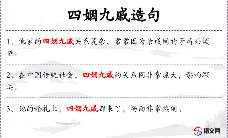 - 四姻九戚:这个成语体现了**传统文化中对家族和亲戚关系的重视。