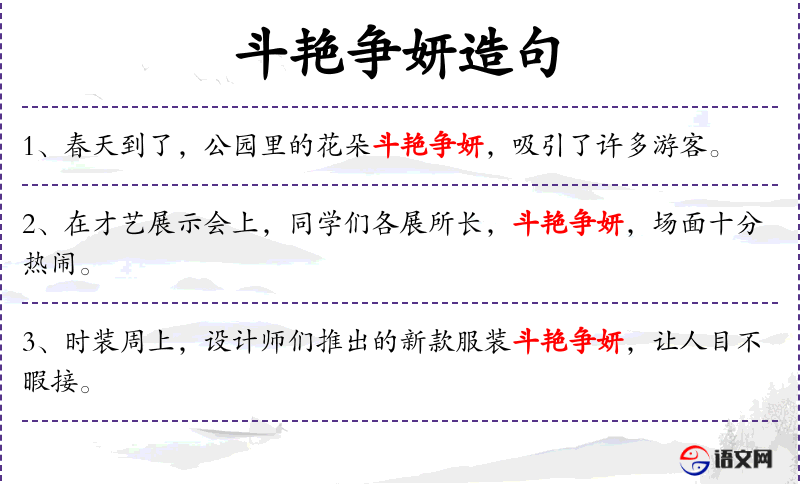 - 成语:“斗艳争妍”和“推陈出新”都是中文成语,体现了中华文化中对竞争和创新的重视。