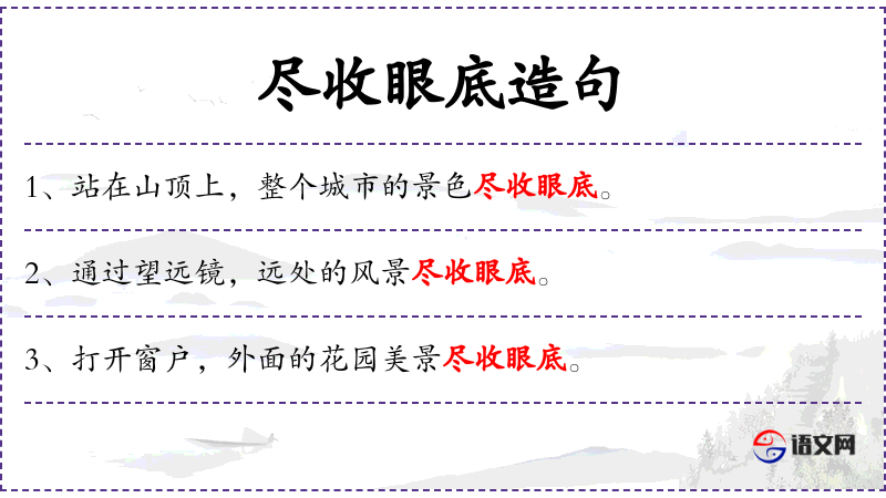 - 尽收眼底:成语,表示完全看到或理解。