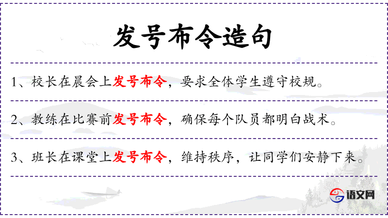 - 可以改写为:“指挥官在战场上发出命令,指导士兵们完成任务。”