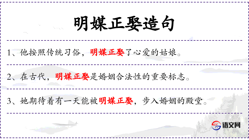 - 明媒正娶:指按照传统*俗,通过媒人介绍并得到双方家长同意的正式婚姻。