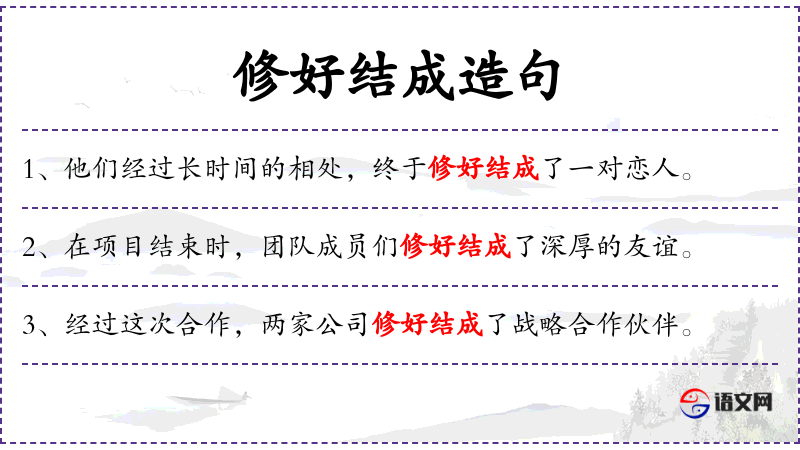 - 修好结成:动词短语,表示通过努力形成或建立。