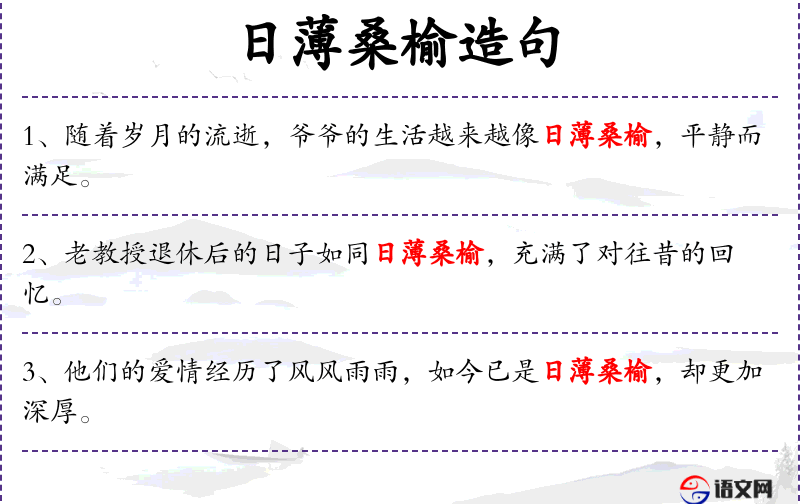 - *日桑榆**:成语,比喻太阳快要落山,比喻人到晚年或事物接近结束。