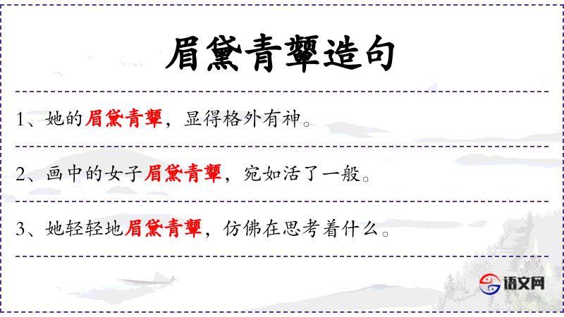 3. 【眉黛青颦】 - 黛:青黑色的颜料,古代女子用来画眉;青颦:古人用青黛染眉,故称青颦。形容女子容貌美丽。