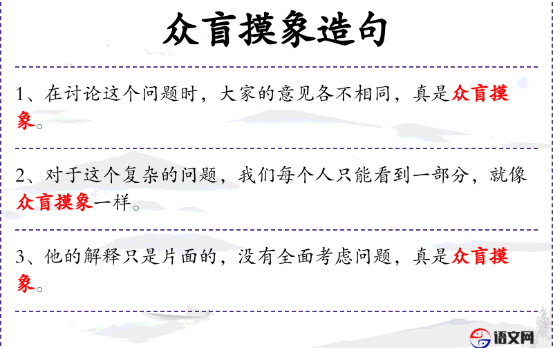 - 众盲摸象:这个成语源自印度的一个寓言故事,讲述几个盲人摸象,每人只摸到象的一部分,因此对象的认知各不相同。这个成语在**文化中常用来比喻对事物只了解一部分,不能全面理解。