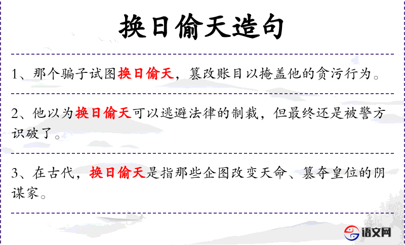 - 换日偷天:这个成语源自**古代,比喻用欺骗手段做违法的事,反映了中华文化中对诚信和法律的重视。