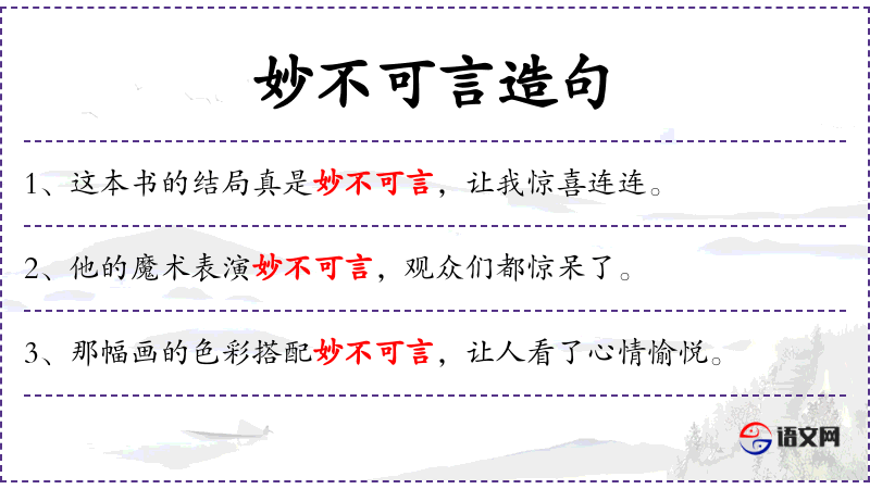 - 妙不可言:难以言表、不可思议、奇妙无比