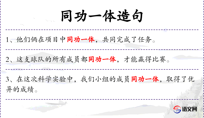 句子:“在这次科学实验中,我们小组的成员同功一体,取得了优异的成绩。”