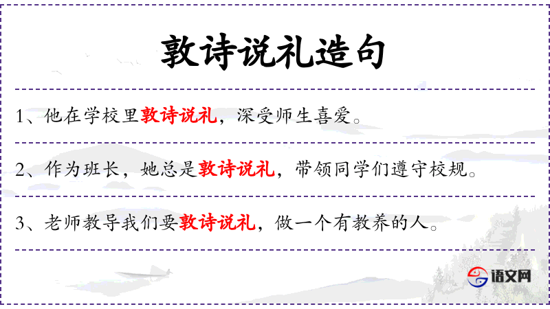 - 敦诗说礼:指在公共场合表现得文雅、有礼貌。
