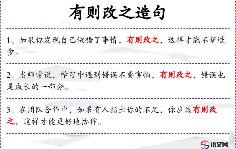 3. 【有则改之】 - 则:就;加:加以。对别人给自己指出的缺点错误,如果有,就改正。