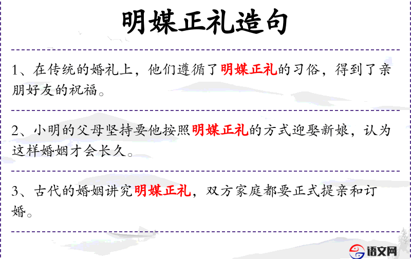 - 明媒正礼:这一成语源自**古代,指的是通过正式的媒人介绍和遵循严格的礼仪程序来完成婚姻。在现代社会,这种形式可能被视为过于繁琐或过时,但仍有人认为它体现了对婚姻的重视和尊重。
