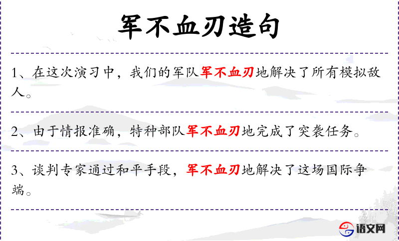 - 军不血刃:比喻不使用武力或暴力就能解决问题,源自成语“兵不血刃”。
