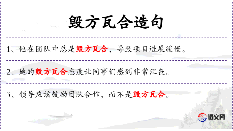 1. 【毁方瓦合】 - 毁去棱角,与瓦砾相合。比喻屈己从众,君子为道不远离于人。后指毁弃自己的原则,迎合世俗。