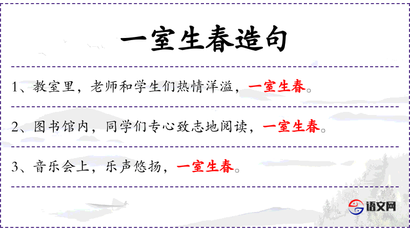 - 补语:一室生春(对教室氛围的描述)