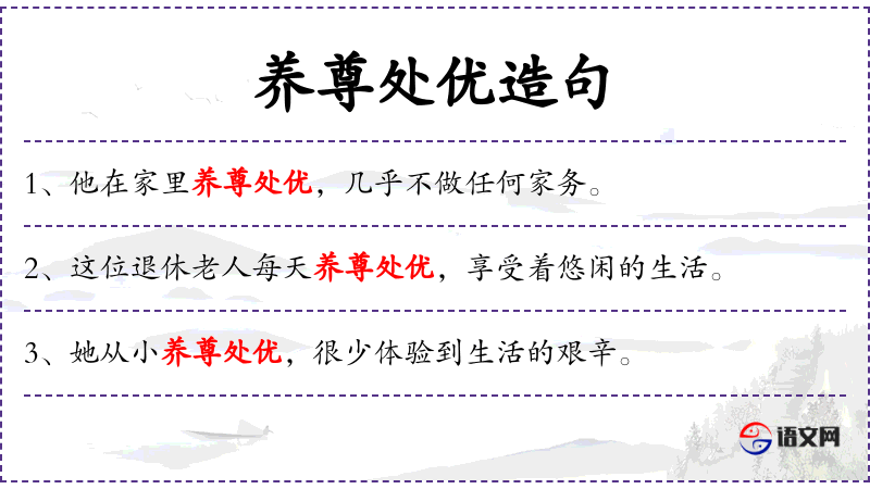 - 养尊处优:指生活在优越的环境中,享受着高贵的待遇。