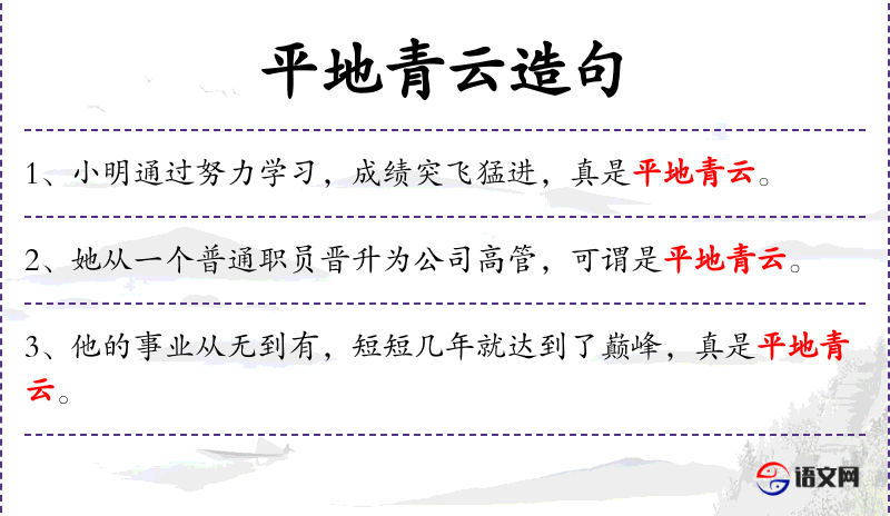 - 日文:彼女は一般社員から会社の重役に昇進し、まさに「平地青雲」と言えるでしょう。