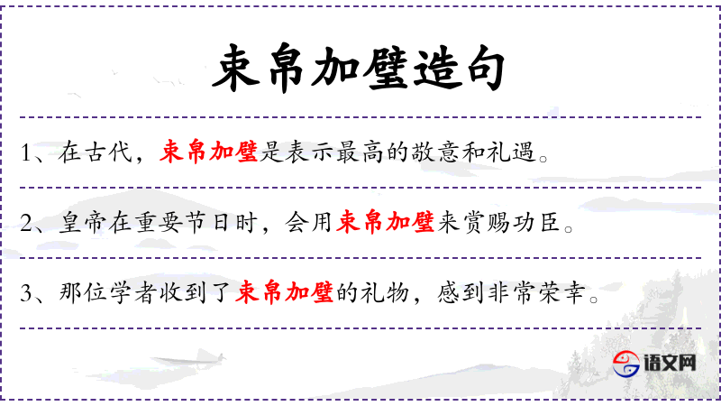 1. 【束帛加璧】 束:一捆。帛:丝织品的总称;束帛:帛五匹;璧:指平圆正中有孔的玉器。五匹帛上面再加美玉。古时聘请或探问时奉送的贵重礼物。