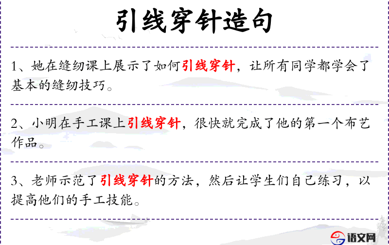 - 句子描述了一个教学场景,老师通过示范引线穿针的方法来教授学生,并让学生自己练习以提高他们的手工技能。