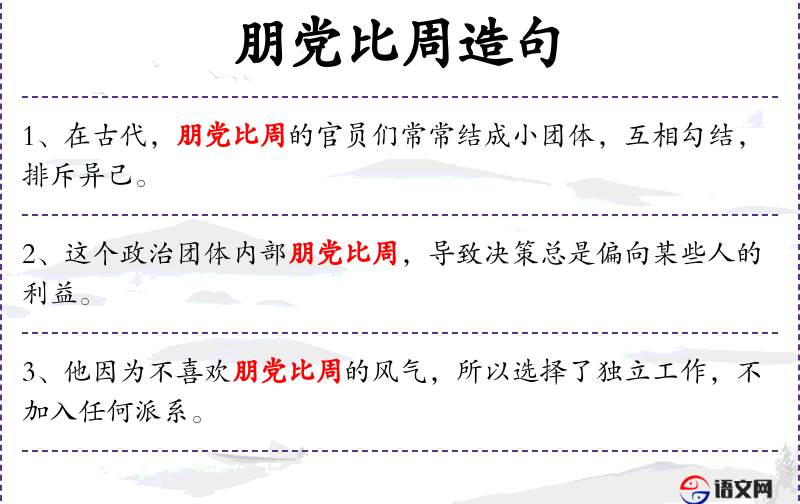 1. 【朋党比周】 - 结党营私,排斥异己。