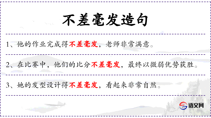 1. 【不差毫发】 毫、发:都是古代的长度名,十毫为发,十发为厘,形容细微。形容一点儿也不差。