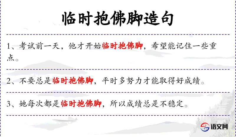 - 临时抱佛脚:指在紧急情况下匆忙准备,通常指考试前突击学*。
