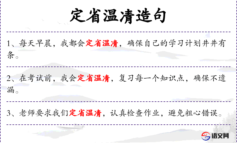句子:“在考试前,我会定省温凊,复*每一个知识点,确保不遗漏。”