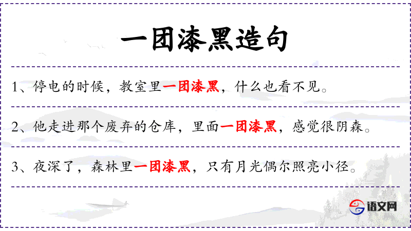 1. 【一团漆黑】 - 形容一片黑暗,没有一点光明。也形容对事情一无所知。