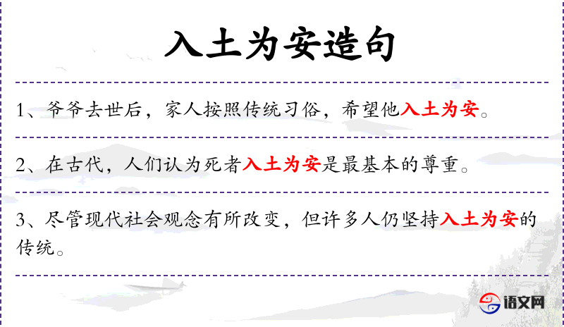 - 入土为安:成语,指人死后埋葬,引申为坚持传统观念。