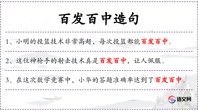 6. 【百发百中】 形容射箭或打枪准确,每次都命中目标。也比喻做事有充分把握。