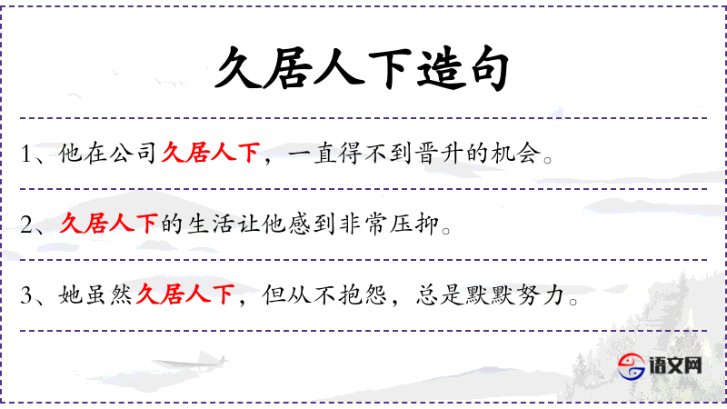 - 久居人下的环境:名词短语,指长期处于较低地位或不利环境。