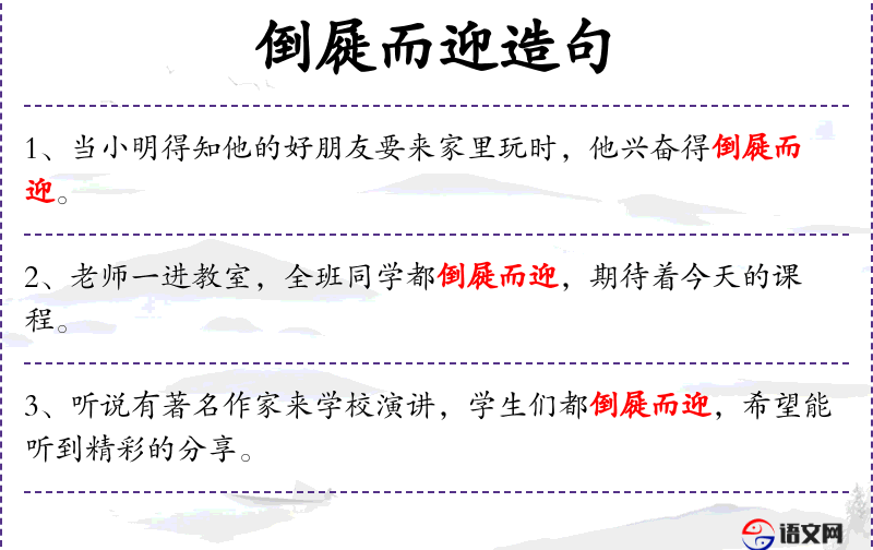 - 倒屣而迎:形容非常热情地迎接,源自古代成语“倒屣相迎”。