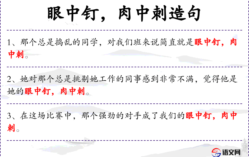 1. 【眼中钉】 - 比喻心中最厌恶、最痛恨的人。