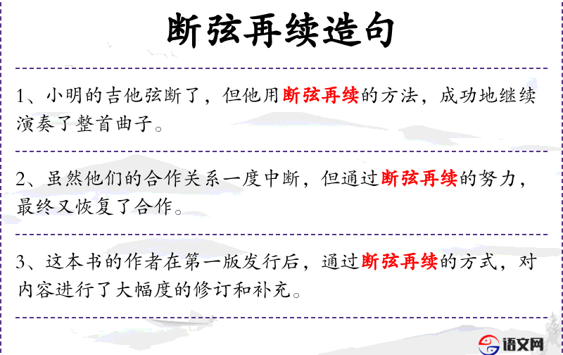 - 断弦再续:比喻中断后重新连接或恢复。