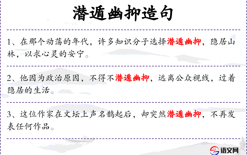 6. 【潜遁幽抑】 潜遁:隐匿、躲藏;幽抑:幽居。逃避世俗,过隐居生活。
