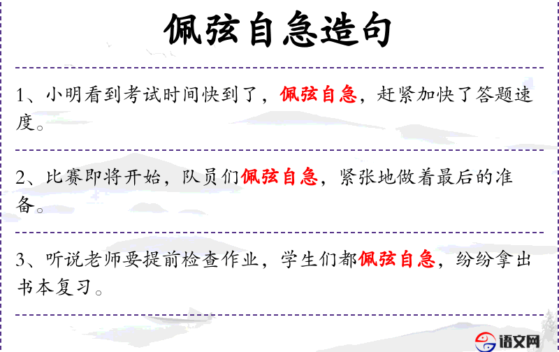 - 相关成语:佩弦自急,出自《左传·宣公十五年》,原意是指弓弦紧绷,比喻心情紧张。