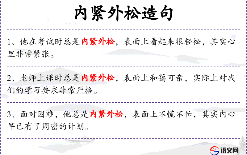 - 内紧外松:形容一个人内心紧张或要求严格,但外表显得轻松或随和。