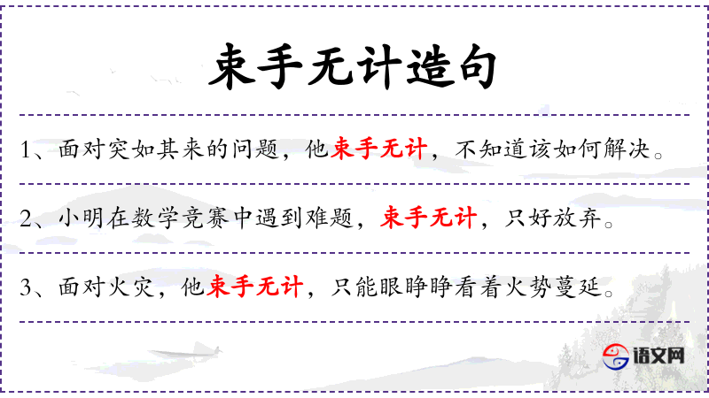 2. 【束手无计】 - 遇到问题,就象手被捆住一样,一点办法也没有。同“束手无策”。