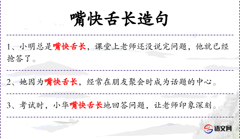 - 状语:在家庭聚会上,总是嘴快舌长地
